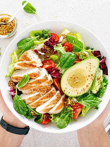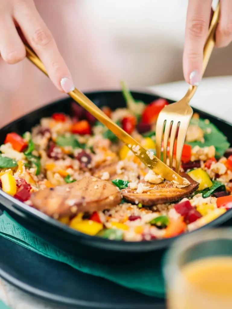 Consumă o masă echilibrată cu cereale integrale, proteine slabe și multe legume, ghidându-te după principiul farfuriei.